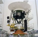This archival photo shows the encapsulation of the Voyager Development Test Model at NASA's Kennedy Space Center's Eastern Test Range. The picture was taken on October 8, 1976.