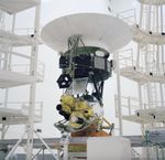 This archival photo shows the encapsulation of the Voyager Development Test Model at NASA's Kennedy Space Center's Eastern Test Range. The picture was taken on October 8, 1976.
