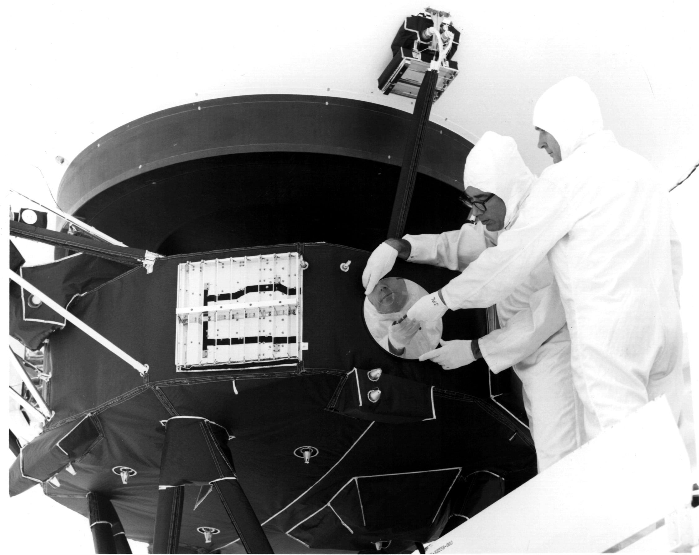 Engineers secure the cover over the Voyager 1 Golden Record in archival image from 1977.