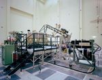 This archival photo shows the system test configuration for Voyager on October 1, 1976. The spacecraft's 10-sided bus is visible behind the catwalk railing in the foreground. The boom that holds several of the spacecraft's science instruments arches above the railing.