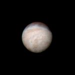 Features as small as 100 km (62 miles) across can be seen in this color image of Neptune's satellite Triton, photographed by Voyager 2 on Aug. 20, 1989, while it was still 5.4 million km (3.3 million miles) from Neptune. Triton's overall pinkish color may be due to reddish materials produced by irradiation of methane gas and ice on the satellite. The dark areas near the top of the image seem to be part of a belt of dark markings observed near Triton's equator at different longitudes. Generally, darker areas on Triton appear to be somewhat redder in color than brighter areas. The central longitude in the image is 123 degrees. Here the south pole is at about 6 o'clock, approximately one sixth of the way up from the bottom. The color image was made from three black and white frames, taken through clear, violet and green filters. The Voyager Mission is conducted by JPL for NASA's Office of Space Science and Applications.