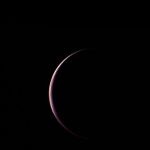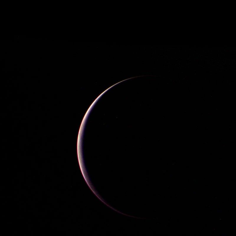 Voyager 2 obtained this parting shot of Triton, Neptune's largest satellite, shortly after closest approach to the moon and passage through its shadow on the morning of Aug. 25, 1989. The distance to Triton was 90,000 kilometers (56,000 thousand miles) and the phase angle was 155 degrees, so that only a thin crescent of Triton's south polar region can be seen. This image was assembled using the green, blue and violet filters of Voyager's wide angle camera. Because of the high phase angle, and perhaps because of scattering sunlight in Triton's hazy atmosphere, few surface features are discernible. Faint linear markings near the center of the crescent may be shadows case by surface features or by clouds, and the brightness of the left (western) horn of the crescent compared to the right horn may be a result of variable haze in the atmosphere. The Voyager Mission is conducted by JPL for NASA's Office of Space Science and Applications.