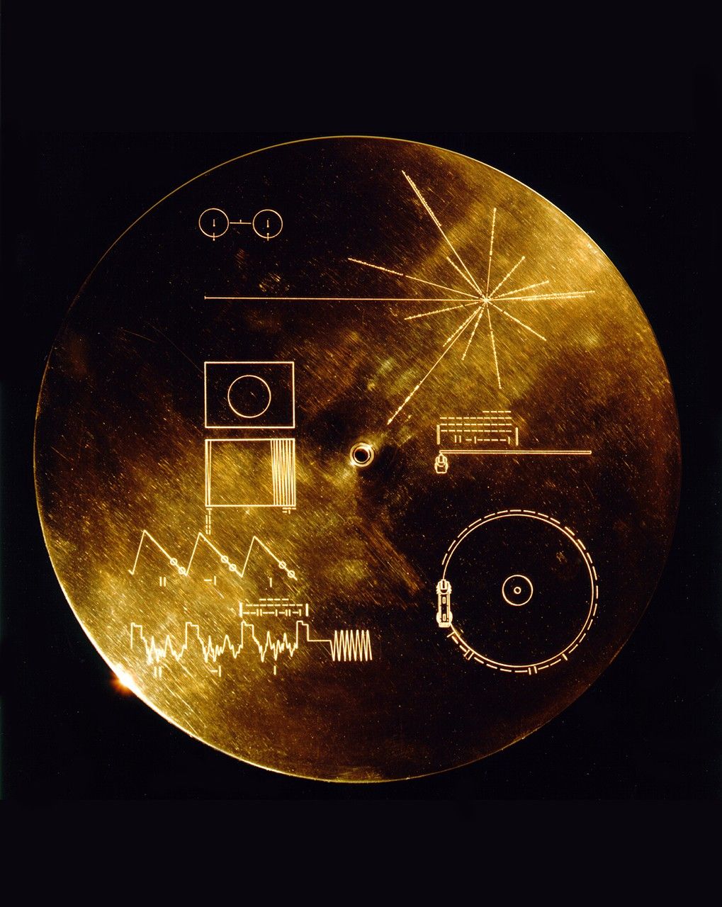 This image highlights the special cargo onboard NASA's Voyager spacecraft: the Golden Record. Each of the two Voyager spacecraft launched in 1977 carry a 12-inch gold-plated phonograph record with images and sounds from Earth. An artist's rendering of the Voyager spacecraft is shown at bottom right, with a yellow circle denoting the location of the Golden Record. The cover of the Golden Record, shown on upper right, carries directions explaining how to play the record, a diagram showing the location of our sun and the two lowest states of the hydrogen atom as a fundamental clock reference. The larger image to the left is a magnified picture of the record inside.