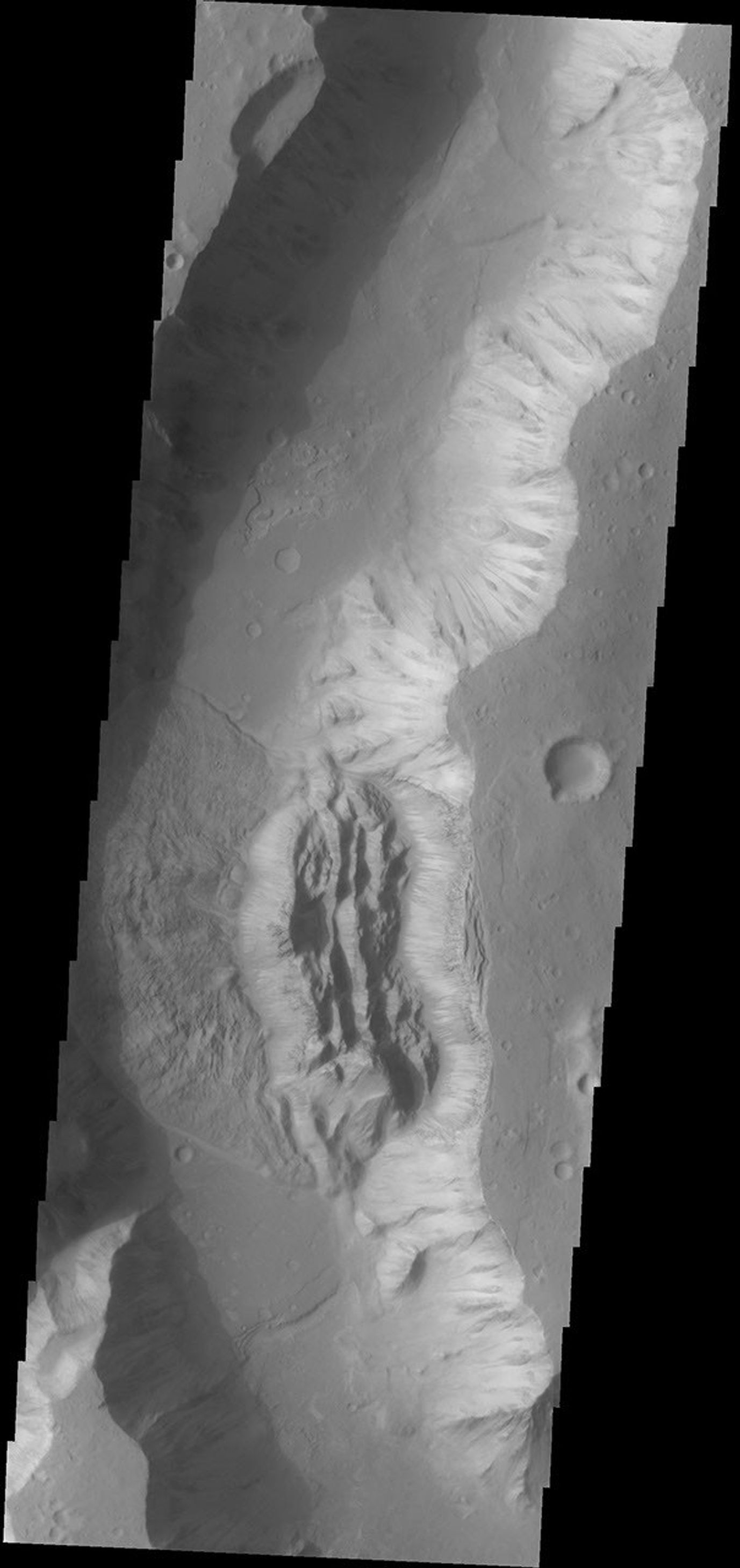 The eastern wall of Shalbatana Vallis has collapsed and formed a landslide that completely covered the valley floor.