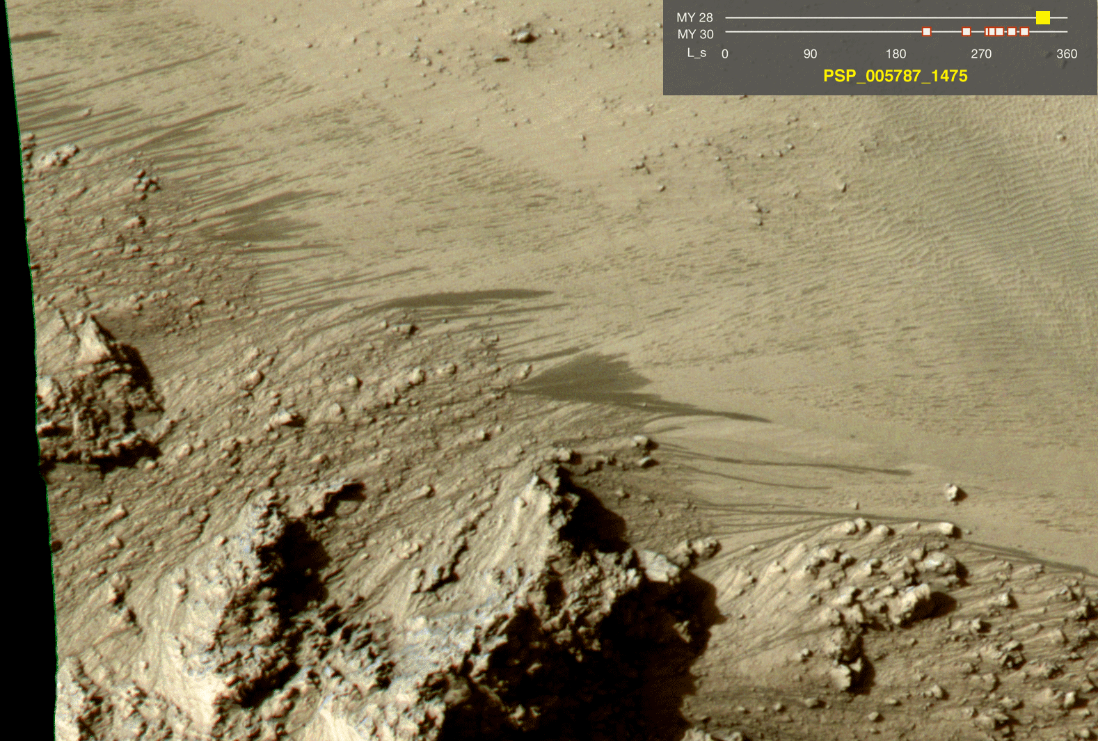 The legend on each image gives the exact HiRISE observation number so that additional image products from the observation and information about the observation can be found on the HiRISE website (e.g., the first image of the series is from PSP_005787_1475, at http://hirise.lpl.arizona.edu/PSP_005787_1475).