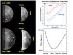 Deep Impact observed a significant change in the strength of a water and hydroxyl signature as the moon rotated around. The highland unit, for example, has a weaker signal near noon (red) and a stronger signal by evening (blue). Taken together, the data show a systematic change in water loss from morning to noon, recovery through the afternoon, and a return to a steady state by evening. This daytime cycle suggests that hydrogen ions in the solar wind may be a source for re-hydration.