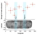 This graph shows variability in the intensity of the water absorption signal detected at Ceres by the Herschel space observatory on March 6, 2013. The most intense readings correspond to two dark regions on the surface known as Piazzi and Region A, identified in the ground-based image of Ceres by the W.M. Keck Observatory on Mauna Kea, Hawaii. The two data points at 110 degrees longitude were taken in a time interval of about 9 hours -- equal to the Ceres rotation period -- showing that variability in the water vapor production is possible even over short periods.