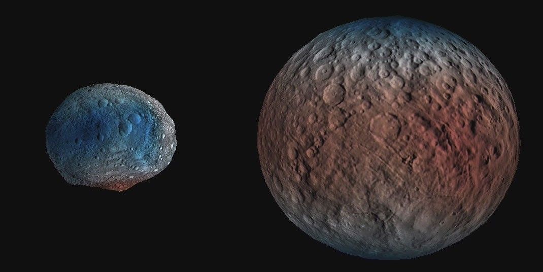 A second animation (Figure 2) compares the hydrogen content of Ceres' regolith with that of the giant asteroid Vesta, which Dawn orbited from 2011 to 2012. These data show Vesta is a much drier world, with a much lower percent of hydrogen in its regolith. Both maps were produced from data acquired by GRaND.
