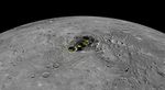 This orthographic projection view provides a look at Mercury's north polar region. The yellow regions in many of the craters mark locations that show evidence for water ice, as detected by Earth-based radar observations from Arecibo Observatory in Puerto Rico. MESSENGER has collected compelling new evidence that the deposits are indeed water ice, including imaging within the permanently shaded interiors of some of the craters, such as Prokofiev and Fuller.