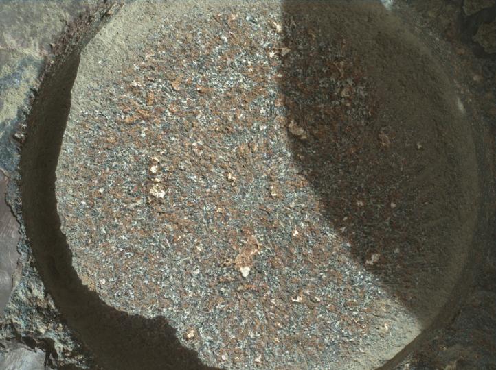NASA's Perseverance Mars rover used its WATSON (Wide Angle Topographic Sensor for Operations and eNgineering) camera to take eight images – combined here into the single composite image – of a rock abraded by a tool on the rover's robotic arm. The images were taken on Aug. 27, 2021 (the 185th Martian day, or sol, of the mission). Nicknamed "Bellegarde," the abraded target is 2 inches (5 centimeters) in diameter.