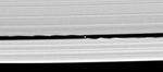 This image was obtained with the Cassini spacecraft narrow-angle camera on May 2, 2005, at a distance of about 594,000 kilometers (369,000 miles) from Saturn. Cassini was about 525,000 kilometers (326,000 miles) above the ringplane when the image was taken. Resolution in the original image was 3 kilometers (2 miles) per pixel. The image has been magnified by a factor of two, and contrast has been enhanced, to aid visibility of the small moonlet.