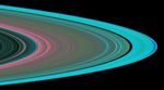 Note the gradual increase in shades of green towards the outer edge of ring A. It indicates gradual increase in the abundance of 5-centimeter (2-inch) and smaller particles. Note also the blue shades in the vicinity of the Keeler gap (the narrow dark band near the edge of ring A). They indicate increased abundance of even smaller particles of diameter less than a centimeter. Frequent collisions between large ring particles in this dynamically active region likely fragment the larger particles into more numerous smaller ones.