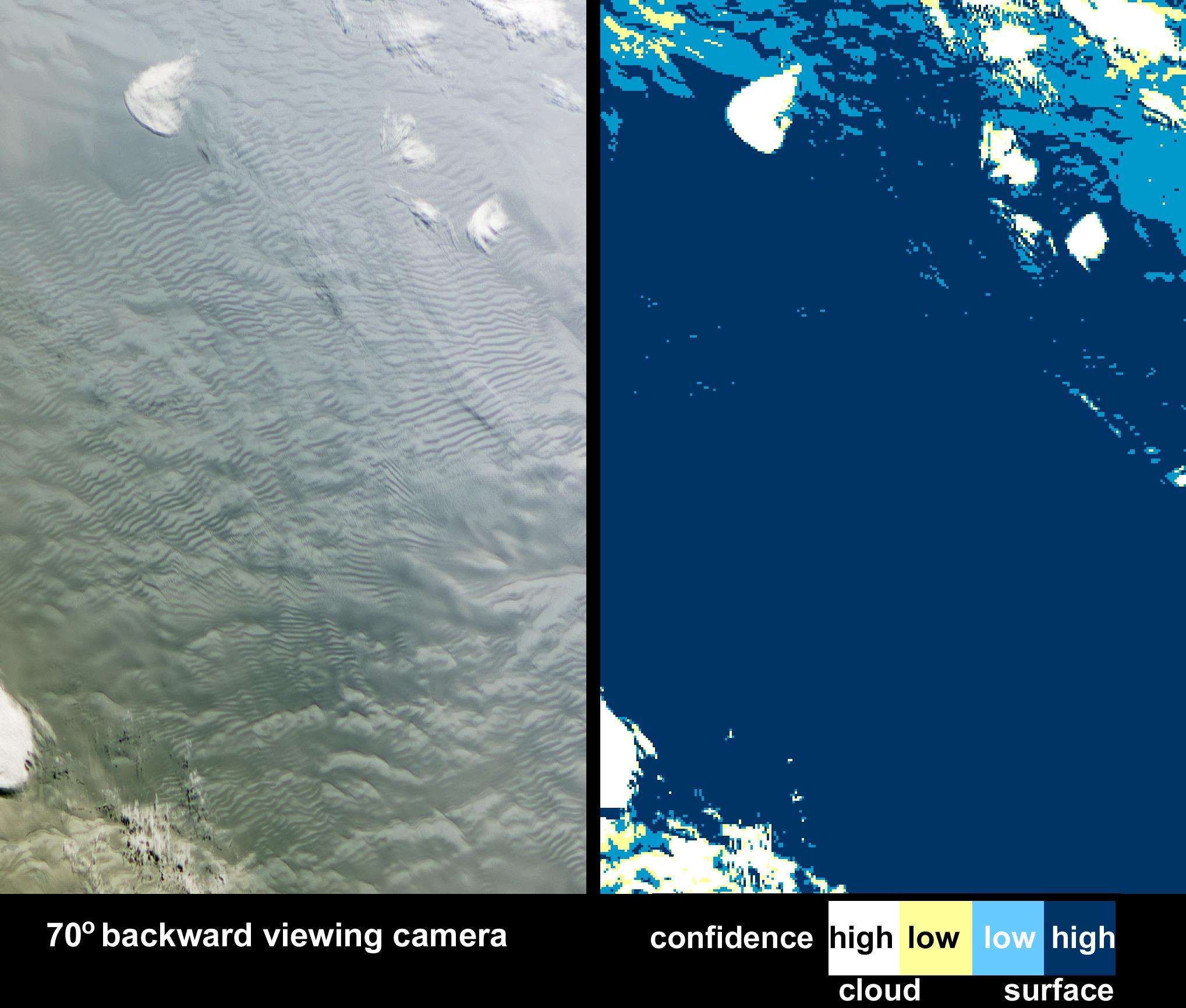 In this image pair, the view from MISR's most oblique backward-viewing camera is on the left, and the color-coded image on the right shows the results of the ASCM. The colors represent the level of certainty in the classification. Areas that were classed as cloudy with high confidence are white, and areas where the confidence was lower are yellow; dark blue shows confidently clear areas, while light blue indicates clear with lower confidence. The ASCM works particularly well at detecting clouds over snow and ice, but also works well over ocean and land. The rippled area on the surface which could have been mistaken for clouds are actually sastrugi -- long wavelike ridges of snow formed by the wind and found on the polar plains. Usually sastrugi are only several centimeters high and several meters apart, but large portions of East Antarctica are covered by mega-sastrugi ice fields, with dune-like features as high as four meters separated by two to five kilometers. The mega-sastrugi fields are a result of unusual snow accumulation and redistribution processes influenced by the prevailing winds and climate conditions. MISR imagery indicates that these mega sastrugi were stationary features between 2002 and 2004.