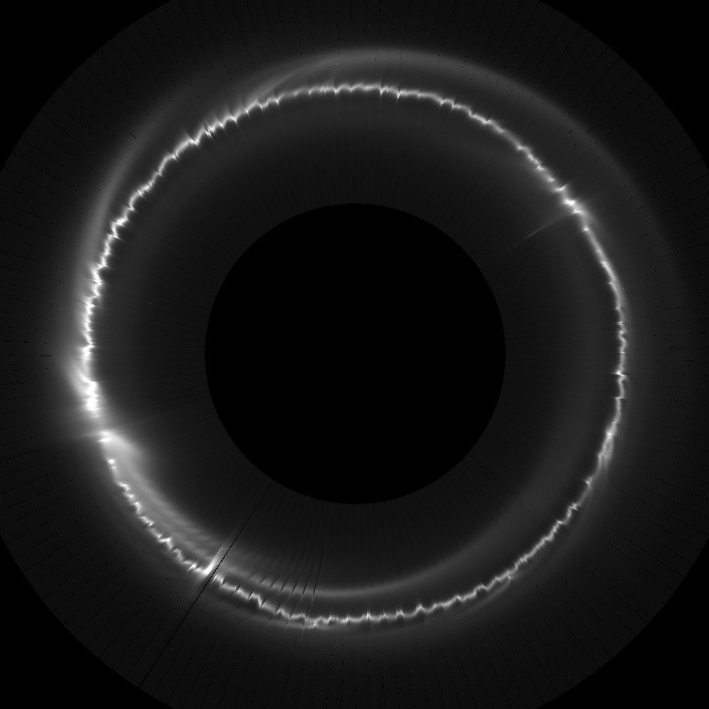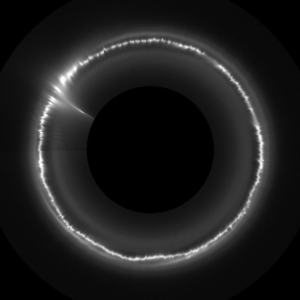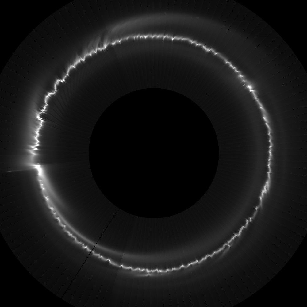 The constant change in Saturn's wavy, wiggly F ring is on display in this set of images obtained by NASA's Cassini spacecraft. The images show a view looking directly down onto the ring with the planet removed from the center. The radial distance from the center of the F ring has been exaggerated by a factor of 140 to make the wiggles and other radial structures more visible.