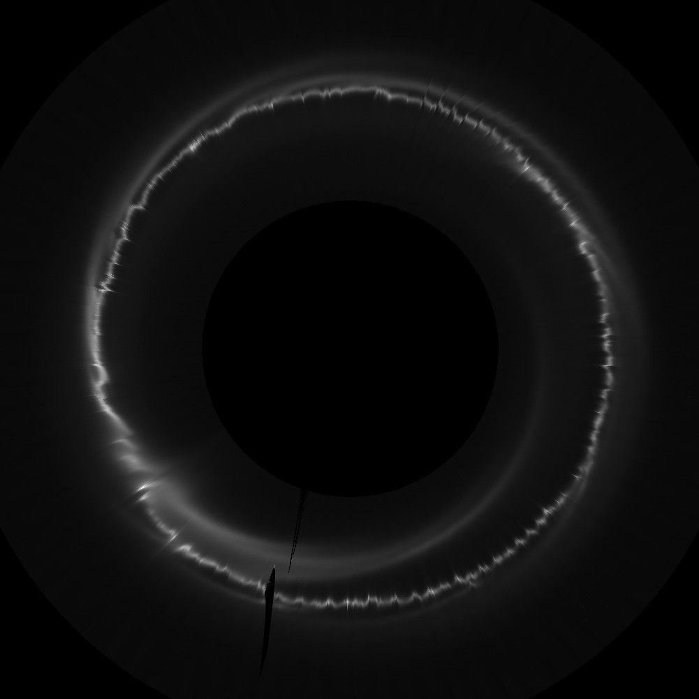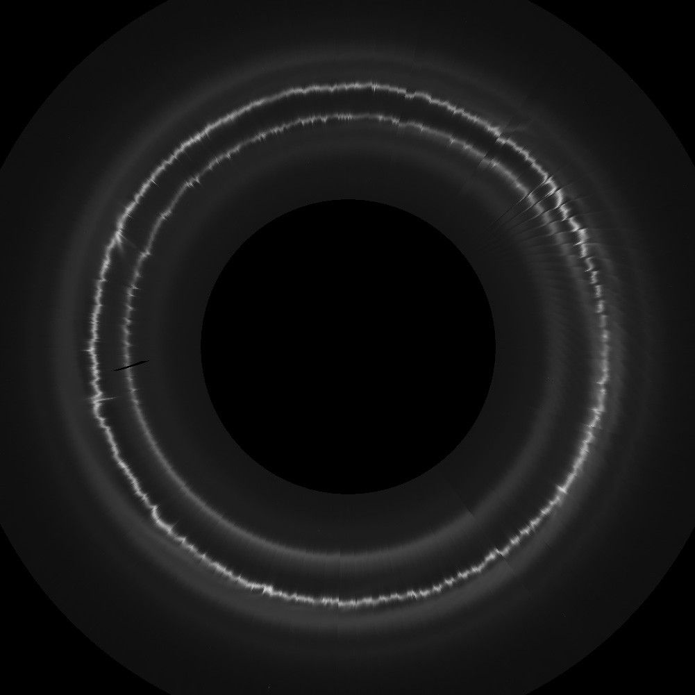 The regular patterns here primarily occur because of the gravitational pull of the moon Prometheus, which averages about 53 miles or 86 kilometers in diameter. Prometheus can create channels and snowballs as they part and push together icy F ring particles. These regular wiggles are about 65 miles (100 kilometers) from top to bottom.