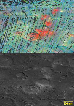 The VIRS composite shows hundreds of individual footprints tracks (minimum 100-200 m across and 3-4 km long) taken from different directions and altitudes. In locations where multiple footprints cover the same area, the footprint with the best illumination for mineralogical interpretation (usually the lowest incidence angle where shadows are minimized) is used for making the map. Due to the nature of MESSENGER's orbit, the VIRS coverage of the southern hemisphere is greater than the north. In the MDIS, mosaic some brightness variations are due to tiling of images taken at different illuminations.