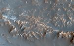 Here we see a portion of the western ejecta deposits emanating from a 10-kilometer impact crater that occurs within the wall of a larger, 60-kilometer-wide crater. In the central part is a lobe-shaped portion of the ejecta blanket from the smaller crater. The crater is elliptical not because of an angled (oblique) impact, but because it occurred on the steep slopes of the wall of a larger crater. This caused it to be truncated along the slope and elongated perpendicular to the slope. As a result, any impact melt from the smaller crater would have preferentially deposited down slope and towards the floor of the larger crater (towards the west).