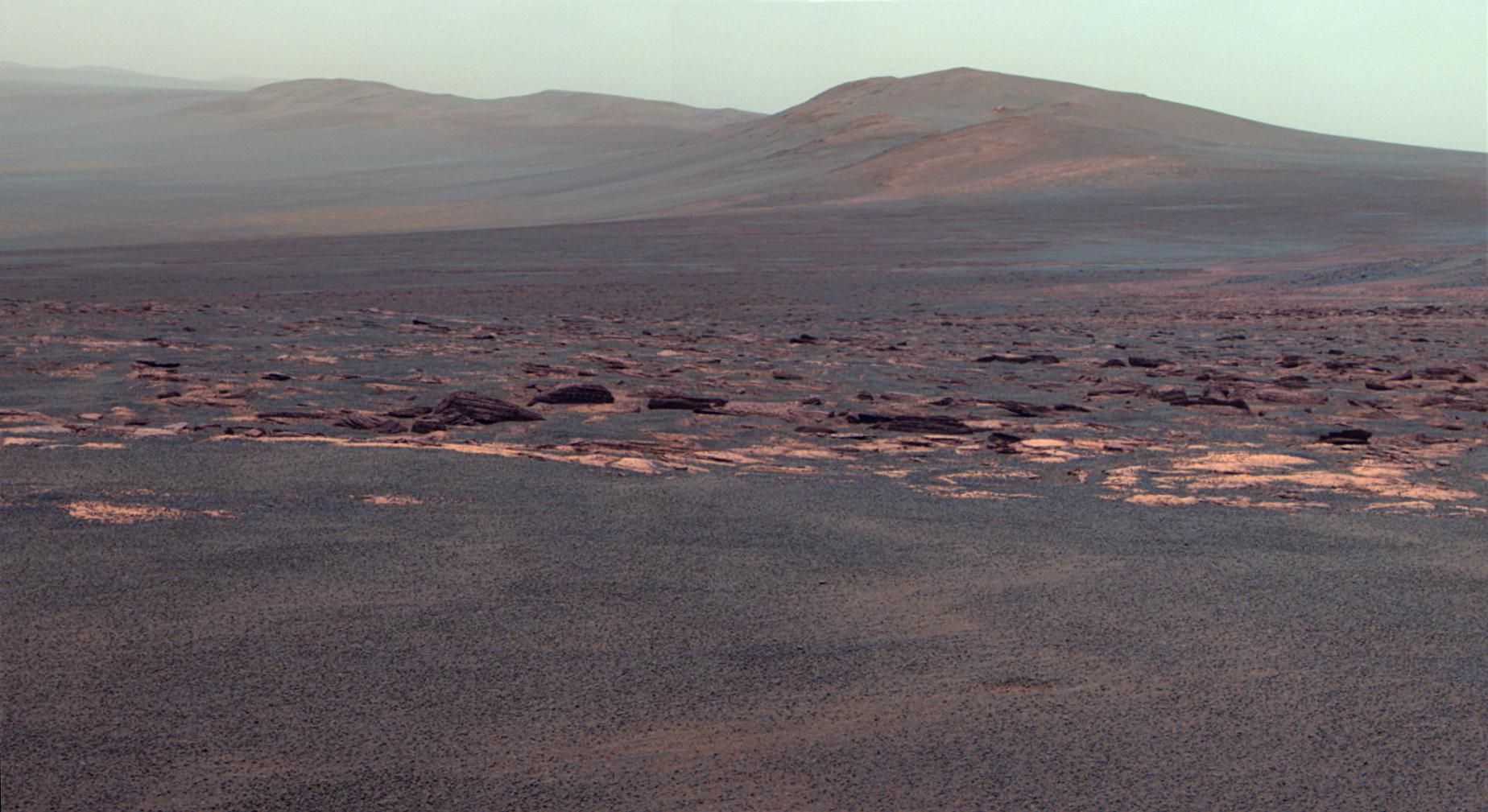 The closest of the distant ridges visible along the Endeavour rim is informally named "Solander Point." Opportunity may investigate that area in the future. The rover's first destination on the rim, called "Spirit Point" in tribute to Opportunity's now-inactive twin, Spirit, is to the left (north) of this scene.