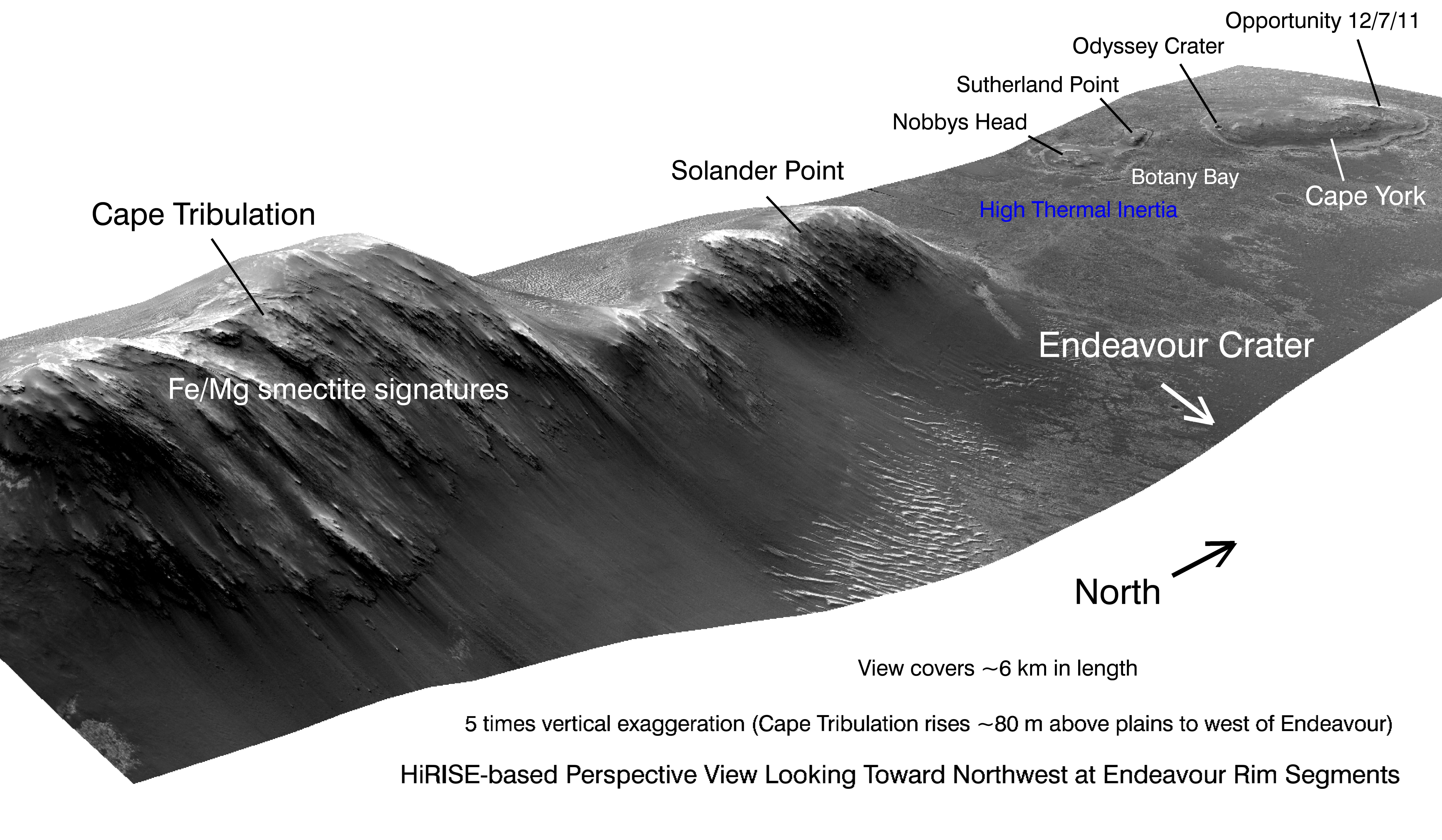 This view shows portions of the western rim of Endeavour Crater on Mars from a perspective looking toward the northwest. The image exaggerates the landscape's vertical dimension five-fold compared with horizontal dimensions. The scene covers about 4 miles (6 kilometers) in length. Major portions of the rim are labeled.
