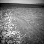 The navigation camera on NASA's Mars Exploration Rover Opportunity recorded this view of the western edge of "Cape York" during the 2,761st Martian day, or sol, of the rover's work on Mars (Oct. 30, 2011). Cape York is a segment of the rim of Endeavour Crater. A bright vein, informally named "Homestake," is visible on the right side of the image. The vein is about as wide as a thumb and about 18 inches (45 centimeters) long. Opportunity examined it in November 2011 and found it to be rich in calcium and sulfur, possibly the calcium-sulfate mineral gypsum.