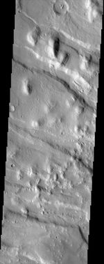 Located north of Olympus Mons and west of Alba Patera, Acheron Fossae provides a record of early tectonic activity in the Tharsis region. Acheron Fossae is a relatively high standing region characterized by multiple subparallel graben. As seen in the image, the graben trend generally to the northwest. The entire area predates the Alba Patera flows (which embay the eastern most Acheron grabens) and the Olympus Mons volcano (one of the youngest Tharsis features). The subdued nature of the highstanding hills, the erosion the graben walls, the eroded rims of all the visible craters, and the wind etching of the flat surfaces all help indicate the great age of Acheron Fossae.