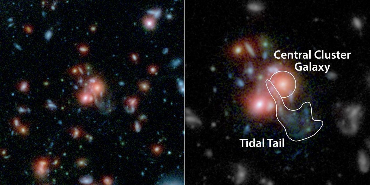 A massive cluster of galaxies, called SpARCS1049+56, can be seen in this multi-wavelength view from NASA's Hubble and Spitzer space telescopes. At the middle of the picture is the largest, central member of the family of galaxies (upper right red dot of central pair). Unlike other central galaxies in clusters, this one is bursting with the birth of new stars.
