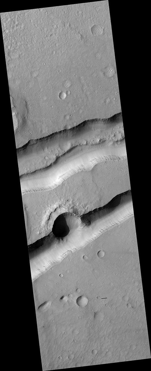 Studying what happened when tells geologists about the history of Mars. A crater that punched through the surface of Mars reveals multiple layers formed previously below the surface. Half of the crater was then destroyed by the opening of the channel.