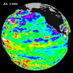 These Jason data were taken during a 10-day collection cycle ending July 3, 2003. The near-equatorial ocean has been very quiet, although sea levels and sea-surface temperatures are near normal or slightly warmer throughout the far western and central equatorial Pacific. Red areas are about 10 centimeters (4 inches) above normal; white areas show the sea-surface height is between 14 and 32 centimeters (6 to 13 inches) above normal. This slight rise in sea levels (warming) contrasts with the Bering Sea, Gulf of Alaska and U.S. West Coast, where lower-than-normal sea-surface levels (blue areas) and cool ocean temperatures continue. The blue areas are between 5 and 13 centimeters (2 and 5 inches) below normal, and the purple areas range from 14 to 18 centimeters (6 to 7 inches) below normal.