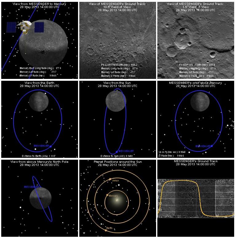 "Where is MESSENGER?" is a longtime section on our website, but last week this feature got an added capability. Using the new global mosaic of Mercury, the feature now shows two views of the spacecraft's ground track: one with a 10.5° field of view like the Wide Angle Camera (middle of top row) and one with a 1.5° field of view like the Narrow Angle Camera (right corner of top row). The "Where is MESSENGER?" section of the website updates every five minutes and was used to generate portions of this movie.