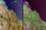 The reddish-orange feature is a result of residue ponds at the Boyne Island alumina plant and smelter, south of the town of Gladstone, where raw bauxite from various mines across Australia is digested to produce nearly 5 million tons of aluminum oxide per year. The red color is caused by hydroxides of iron that exist as impurities within the bauxite.