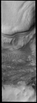 This image shows the margin of the south polar cap. The polar layers are prominently shown against the rocky surroundings.