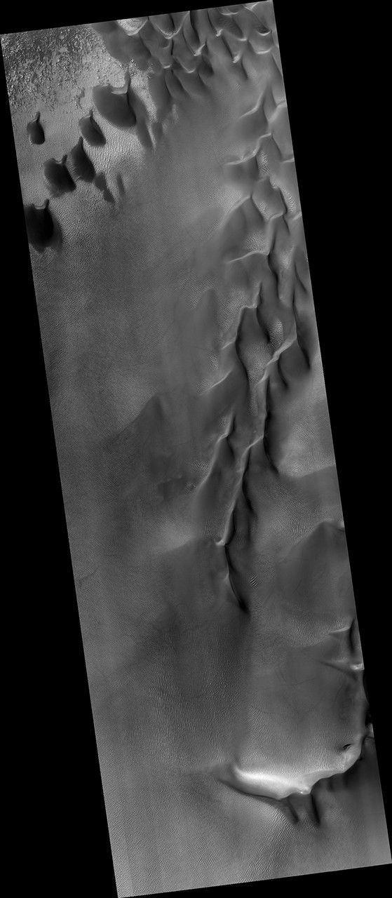Many of the craters in the Southern highlands of Mars contain sand dunes, and HiRISE is still in the process of mapping these dunes and determining how active they are today. So far, the dunes in these craters appear to be a mixed bunch, with some dunes actively advancing while others seem to be frozen in place. This image will be compared to a previous picture, to see how these dunes have changed since 2008.