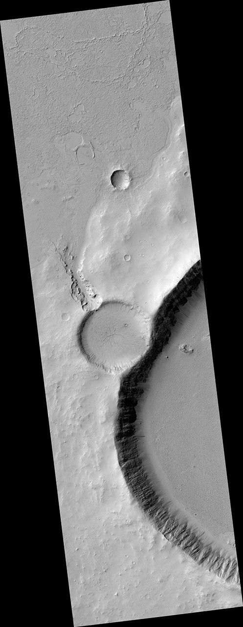 This image shows an impact crater that was cut by lava in the Elysium Planitia region of Mars. The relatively flat, shallow floor, rough surface texture, and possible cooling cracks seem to indicate that the crater was partially filled with lava. The northern part of the image also shows a more extensive lava flow deposit that surrounds the impact ejecta of the largest impact crater in the image.