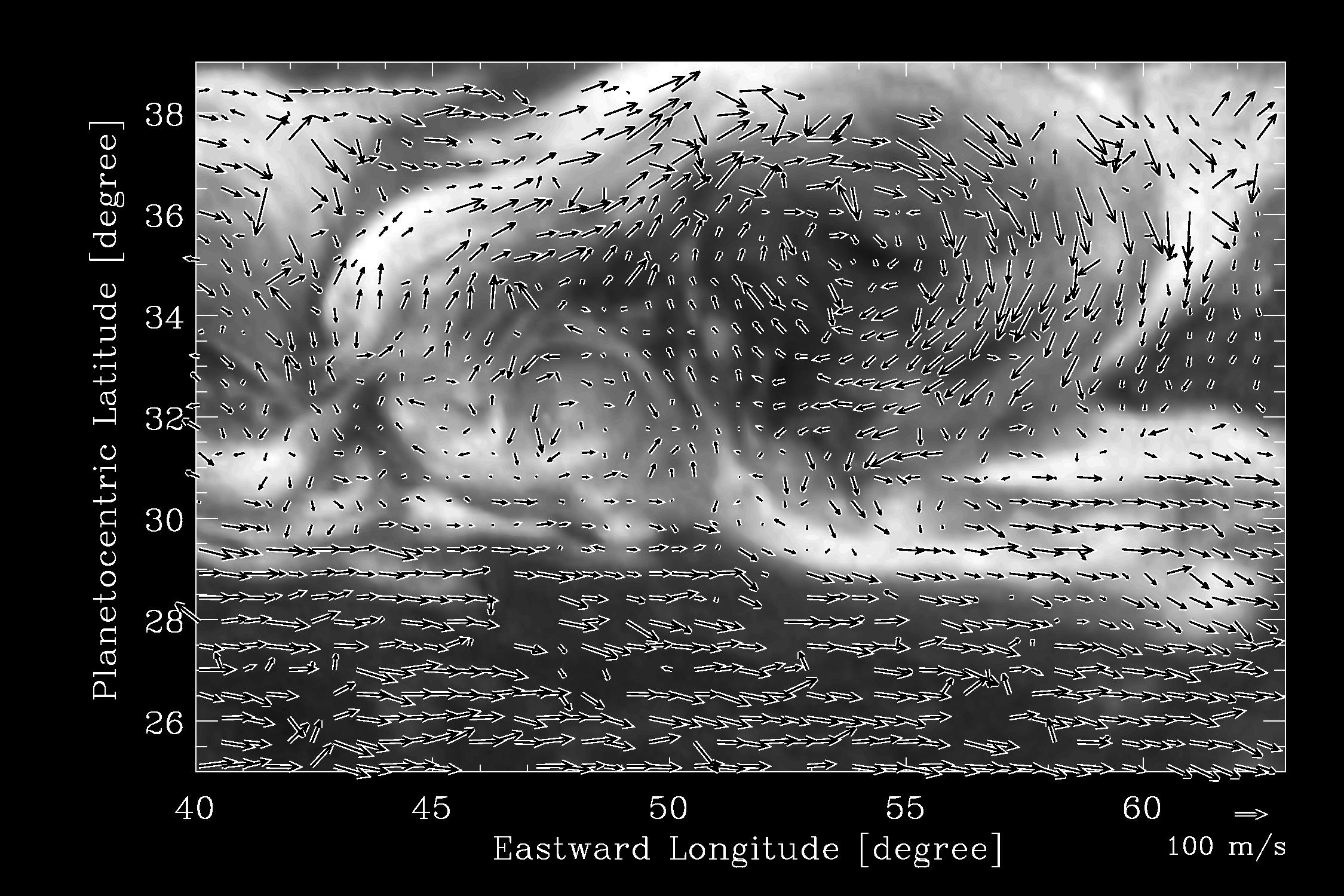 This image from NASA's Cassini spacecraft reveals the wind patterns within a large vortex that was spawned by a giant northern storm on Saturn. The arrows indicate the local direction of the winds. The vortex, a clockwise-spinning swirl, was spun off from the head of this storm in early December 2010, shortly after the storm erupted. The bright head of the storm moved swiftly in a westward direction around the planet, while this vortex drifted more slowly.
