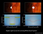 The plot on the right shows what happens when the white dwarf passes in front of, or transits, the star. The dip in brightness is incredibly subtle because the white dwarf, while just over half as massive as our sun, is only the size of Earth, much smaller than the red dwarf star. The blue line shows what would be expected given the size of the white dwarf. The red line reveals what was actually observed: the mass of the white dwarf is so great, that its gravity bent and magnified the light of the red star. Because the star's light was magnified, the transiting white dwarf blocked an even smaller fraction of the total starlight than it would have without the distortion. This effect, called gravitational lensing, allowed the researchers to precisely measure the mass of the white dwarf.