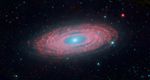 This image is a composite of three different wavelengths from Spitzer's infrared array camera. The shortest wavelengths are displayed inblue, and mostly show the older stars in NGC 2841, as well as foreground stars in our own Milky Way galaxy. The cooler areas are highlighted in red, and show the dusty, gaseous regions of the galaxy.