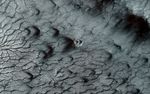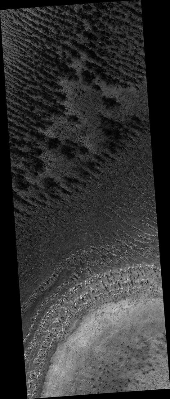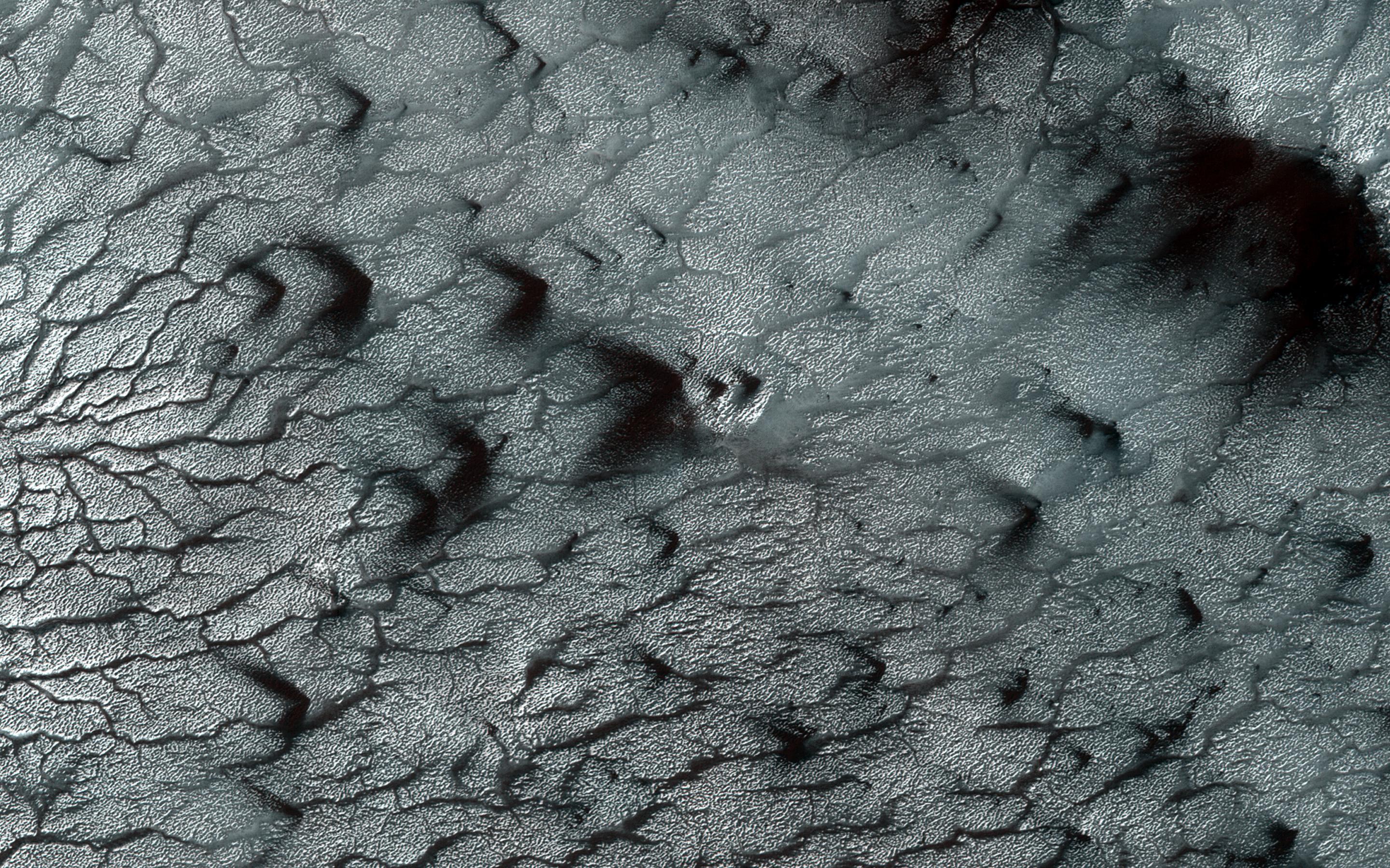 At this site, the channels are wider than we see elsewhere on Mars, perhaps meaning that the spider-like (or more scientifically, "araneiform") terrain here is older, or that the surface is more easily eroded. Seasonal fans of eroded surface material, pointed in two different directions, are deposited on the remaining ice.