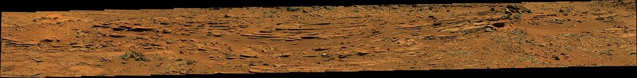 The mosaic has been white-balanced to show what the rocks would look like if they were on Earth. A raw-color version is also available, showing what the rocks look like on Mars to the camera.