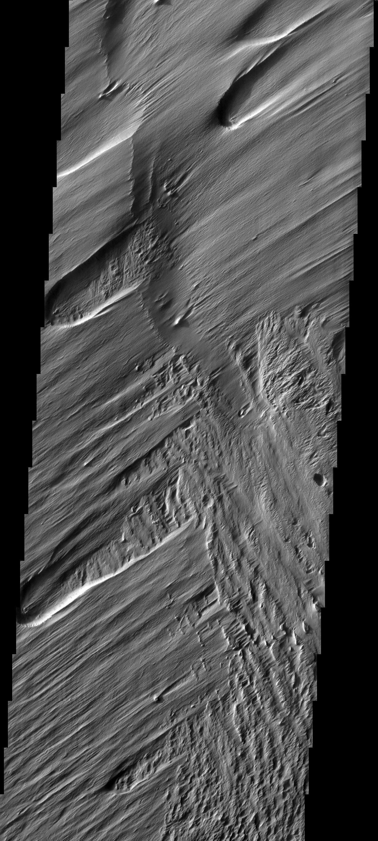 Note: this THEMIS visual image has not been radiometrically nor geometrically calibrated for this preliminary release. An empirical correction has been performed to remove instrumental effects. A linear shift has been applied in the cross-track and down-track direction to approximate spacecraft and planetary motion. Fully calibrated and geometrically projected images will be released through the Planetary Data System in accordance with Project policies at a later time.