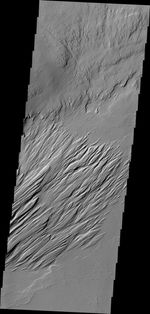 Located near Amazonis Mensa, this region of Mars has undergone erosion by wind. Long linear hills being created by the wind are called yardangs.