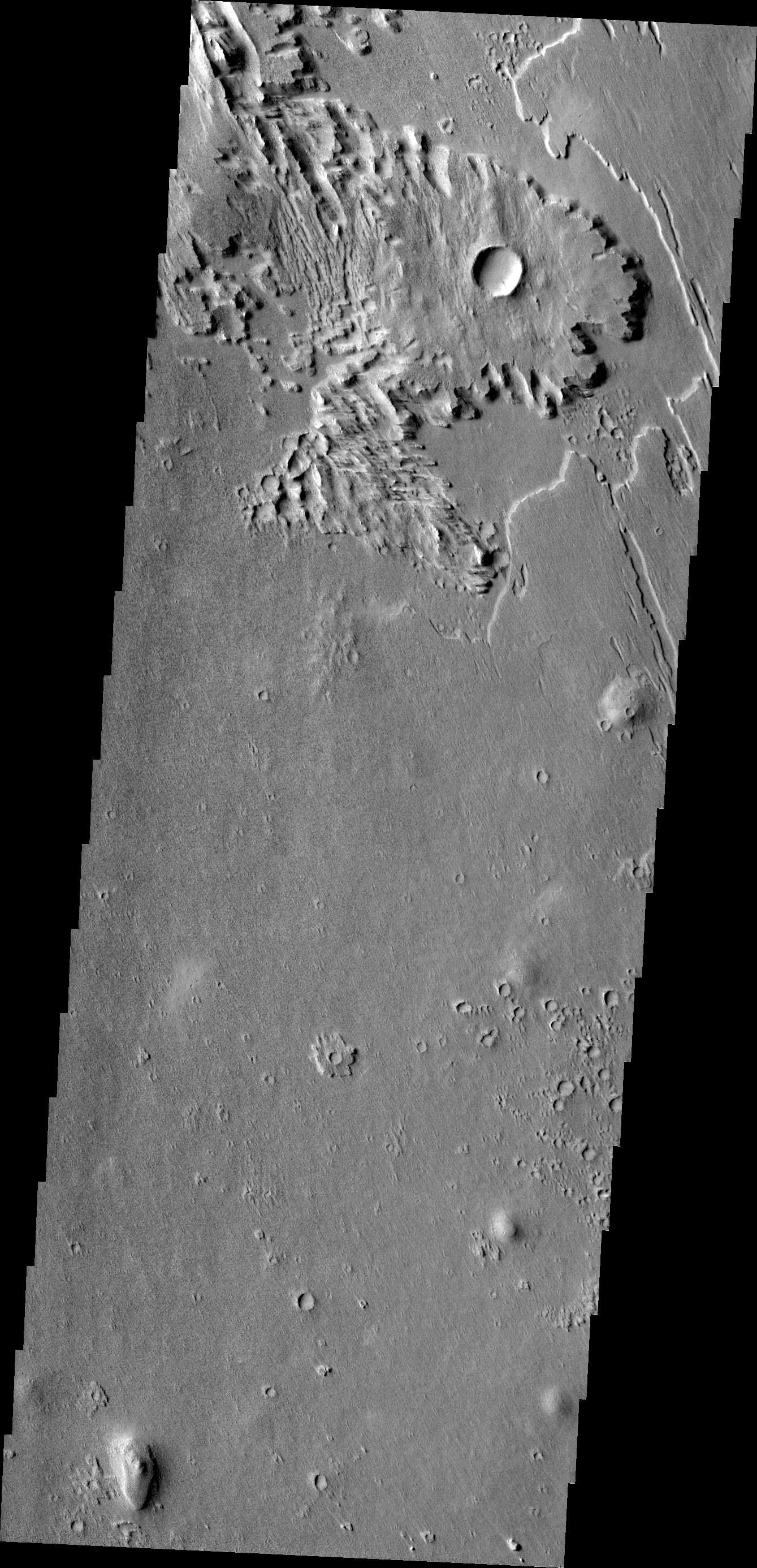 This wind eroded crater is located between Eumenides and Gordii Dorsa. The ejecta of the crater is more resistant to the wind than the surrounding materials.