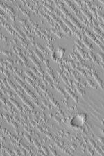 This May 2003 Mars Global Surveyor (MGS) Mars Orbiter Camera (MOC) image shows a suite of wind-sculpted ridges on the plains northwest of the Tharsis volcano, Ascraeus Mons. The two circular features are old meteor impact craters. The ridges running from upper left toward lower right may have once been sand dunes. These dunes and the two craters were later covered by thick accumulations of dust or volcanic ash, and this fine material was later eroded by wind to form the somewhat triangular tails and markings that point toward the upper right. The area shown is 1.7 km (1.1 mi) wide and located near 16.0°N, 107.6°W. Sunlight illuminates the scene from the lower left.