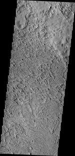 The unusual surface texture seen in the VIS image reflects the resistance of the surface rocks to erosion by the wind. This image shows part of the northern end of Gordii Dorsum.