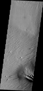 Constant sand-blasting by the winds on Mars have eroded and sculpted the surface in the equatorial region around Medusae Fossae.