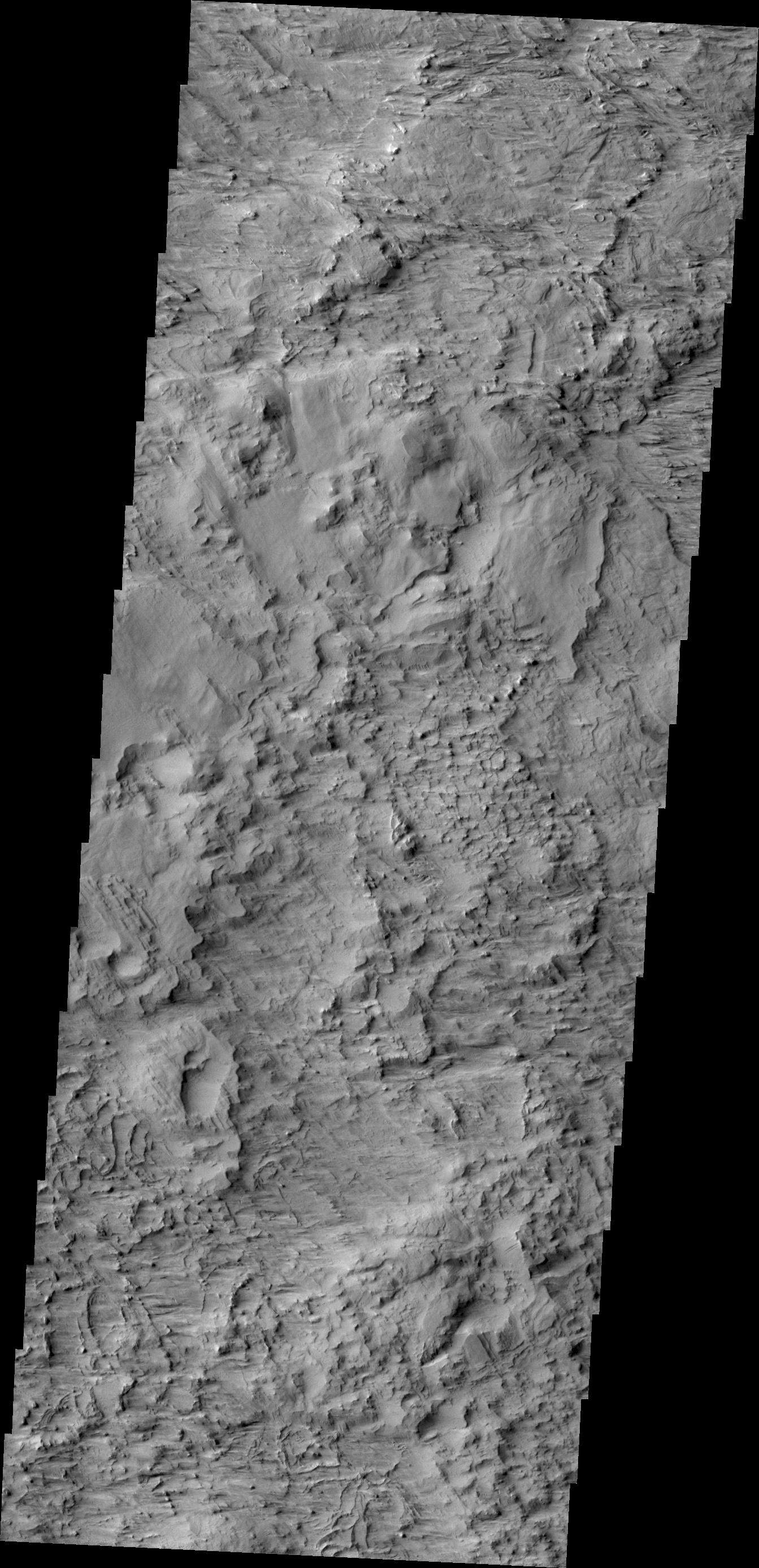 Today's VIS image shows a wind eroded surface located between the lava flows of Olympus Mons and the wind eroded ridge called Gordii Dorsum.