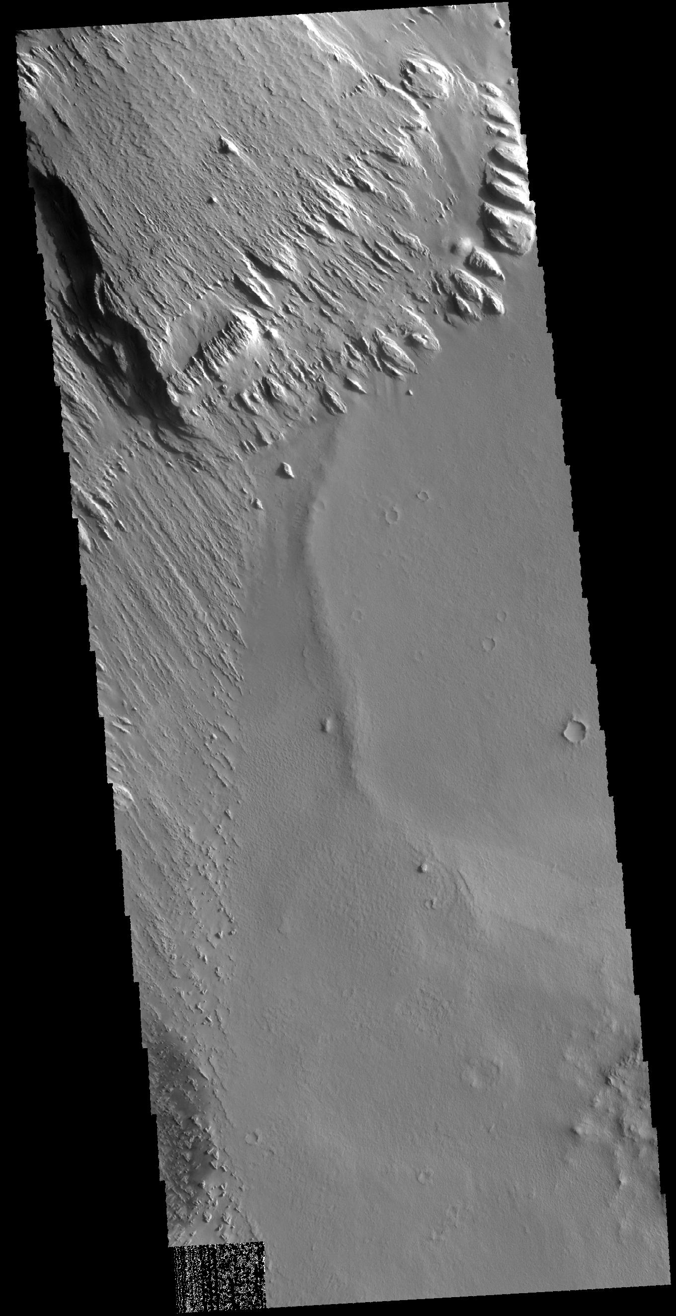 Today's VIS image is located near Memnonia Sulci, on the edge of Lucus Planum. The material at the top and left side of the image has been eroded by the wind to form features called yardangs. Yardangs form in a poorly cemented material where the wind cuts linear valleys, removing some of the material and leaving parallel ridges behind. The direction of the ridge/valley is aligned with the wind direction.