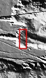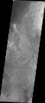 Image information: VIS instrument. Latitude -6.3, Longitude 283 East (77 West). 19 meter/pixel resolution.Note: this THEMIS visual image has not been radiometrically nor geometrically calibrated for this preliminary release. An empirical correction has been performed to remove instrumental effects. A linear shift has been applied in the cross-track and down-track direction to approximate spacecraft and planetary motion. Fully calibrated and geometrically projected images will be released through the Planetary Data System in accordance with Project policies at a later time.