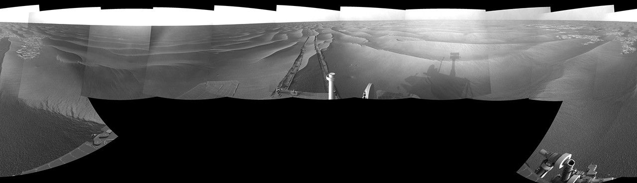 NASA's Mars Exploration Rover Opportunity used its navigation camera to take the images combined into this stereo, full-circle view of the rover's surroundings just after driving 111 meters (364 feet) on the 1,797th Martian day, or sol, of Opportunity's surface mission (Feb. 12, 2009). North is at the center; south at both ends.