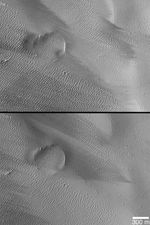 Mars is a dynamic planet. This pair of Mars Global Surveyor (MGS) Mars Orbiter Camera (MOC) pictures, taken 2 Mars years apart, show changes in dark streak patterns caused by wind movement of dust. The top picture was taken in July 1999, the bottom one in March 2003. The pair of images are in Tharsis near 9.5°S, 128.5°W. Sunlight illuminates both from the upper left.