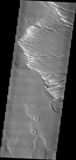Note: this THEMIS visual image has not been radiometrically nor geometrically calibrated for this preliminary release. An empirical correction has been performed to remove instrumental effects. A linear shift has been applied in the cross-track and down-track direction to approximate spacecraft and planetary motion. Fully calibrated and geometrically projected images will be released through the Planetary Data System in accordance with Project policies at a later time.